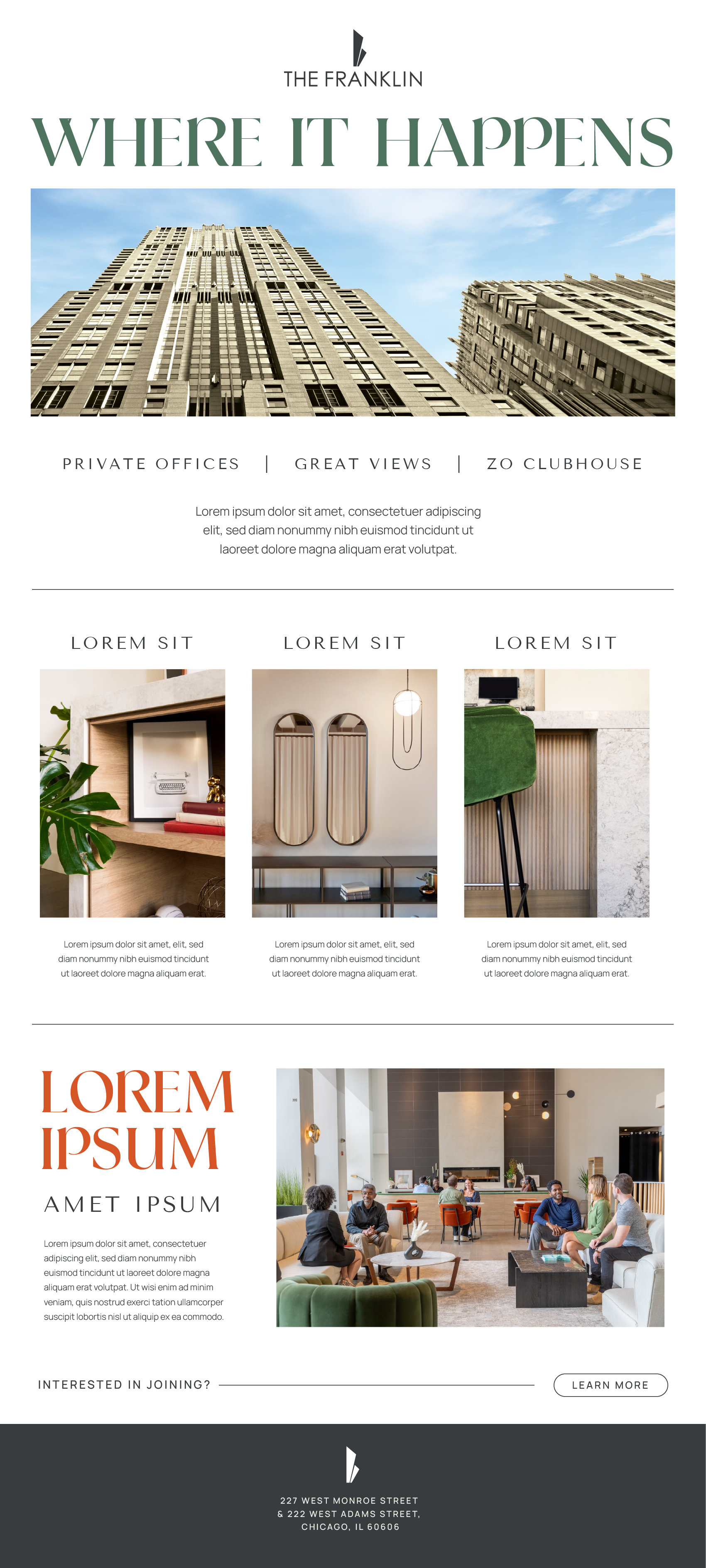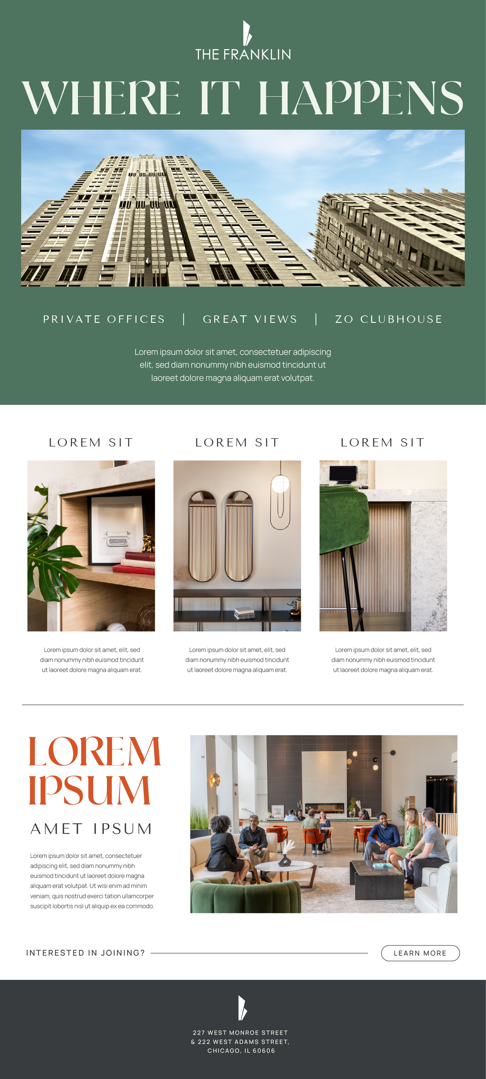 Tishman Speyer approached us to refresh the visual identity for The Franklin, one of their Chicago office buildings. I led the redesign, creating a modern, sophisticated system that gave the property a clear and elevated presence. The new brand highlighted The Franklin’s state-of-the-art amenities and Tishman Speyer’s commitment to sustainability through clean typography, a refined color palette, and a timeless visual tone. Designed to flex across social, print, and digital, the refreshed identity brought cohesion and polish to a building that had never truly had a visual voice.